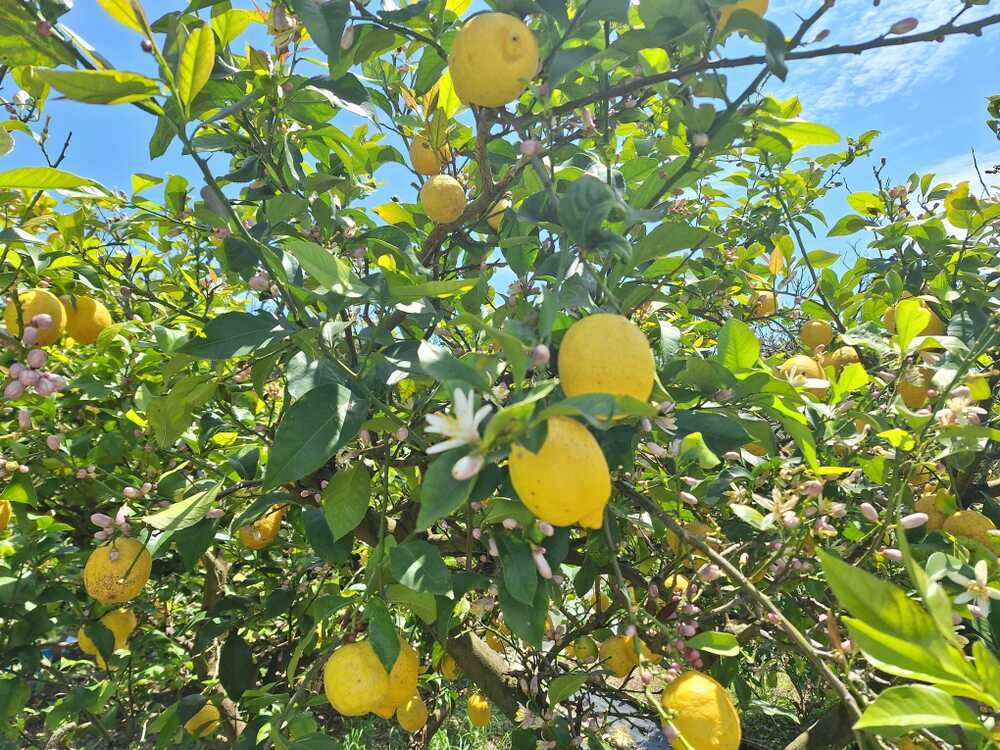 レモンの木は、果実が完熟の状態になっており、そのそばで花が咲きつつあります。レモンの花のつぼみは淡いピンクで、開いた花弁は白色です。セイヨウミツバチの他、多くのハチやハエ、カナブンが集まり、受粉を助けてくれます。
