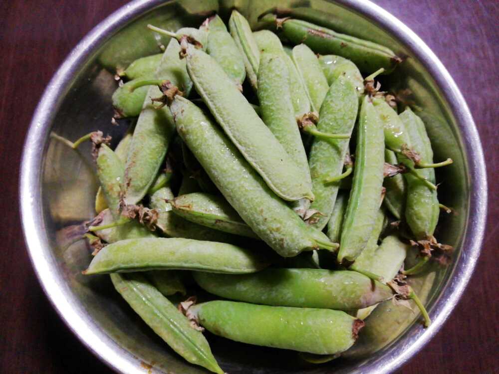 グリンピースを収穫しました。さや一杯に大きくなっています。豆ごはん、スープ、煮物、楽しみです。