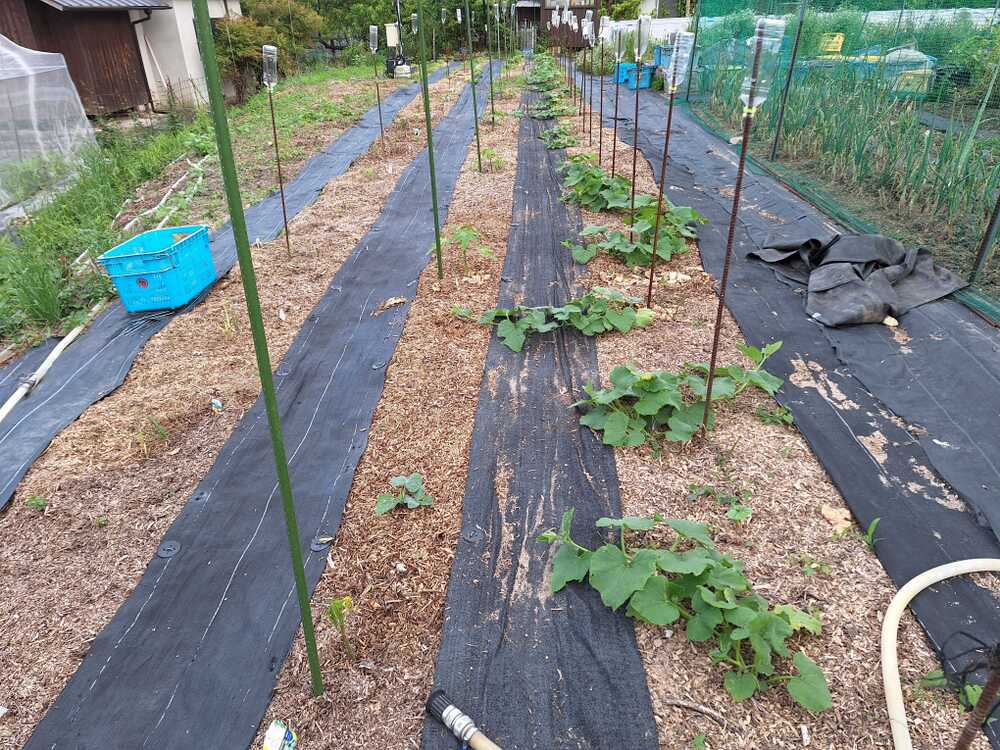 先日定植したバターナッツカボチャのツルが伸びてきました。さて、摘心をすると、開花待ちです。楽しみですね。