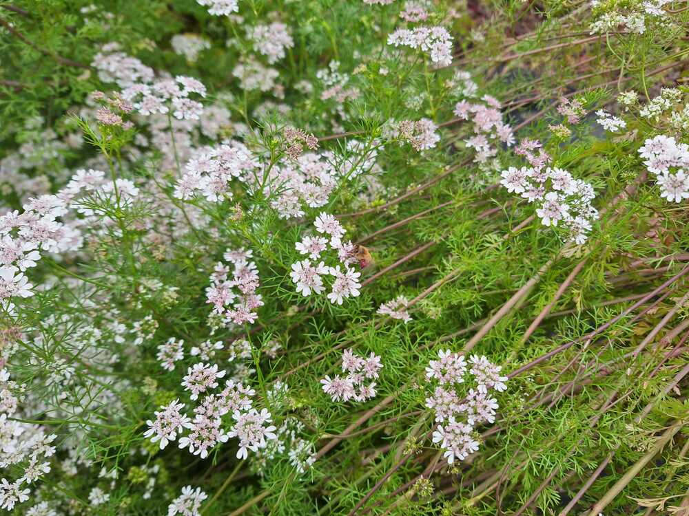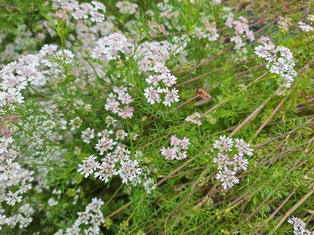 セイヨウミツバチが、大好きなパクチーの花粉を集めていました。パクチーの花の色は、白っぽいピンクなのですが、セイヨウミツバチの集めている花粉は、真っ赤。新しい驚きがありました。