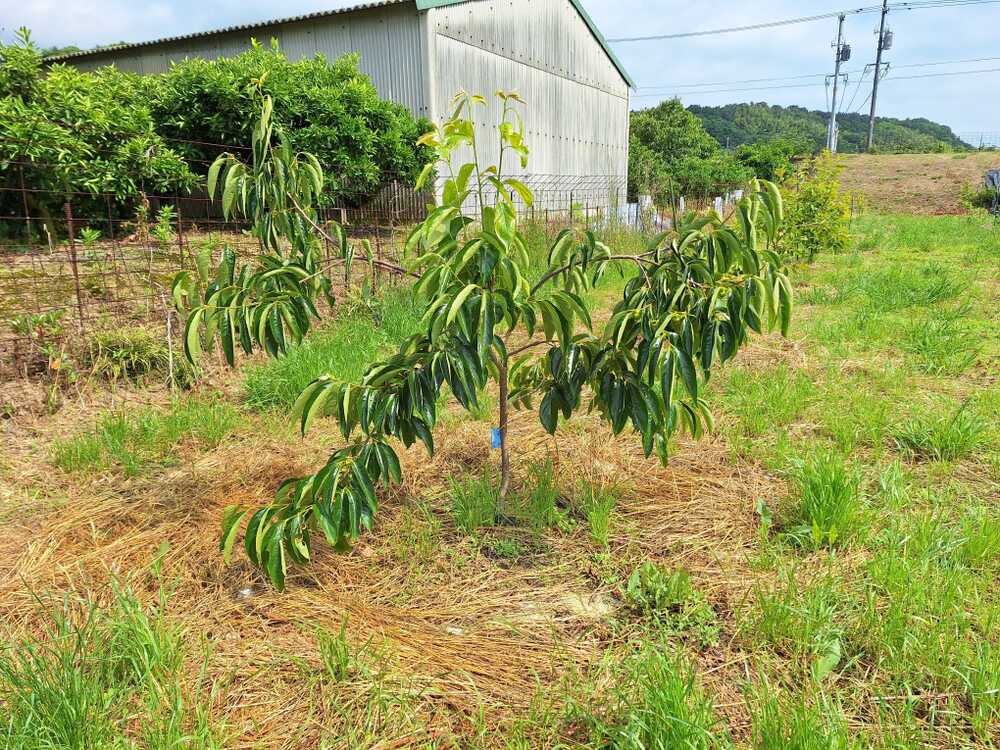 植えて3年目の柿(カキ)の苗木に、今年初めて着果しました。「桃栗3年、柿8年」と言われていますが、思っていたより早かったです。ありがたいような、大丈夫か心配なような。