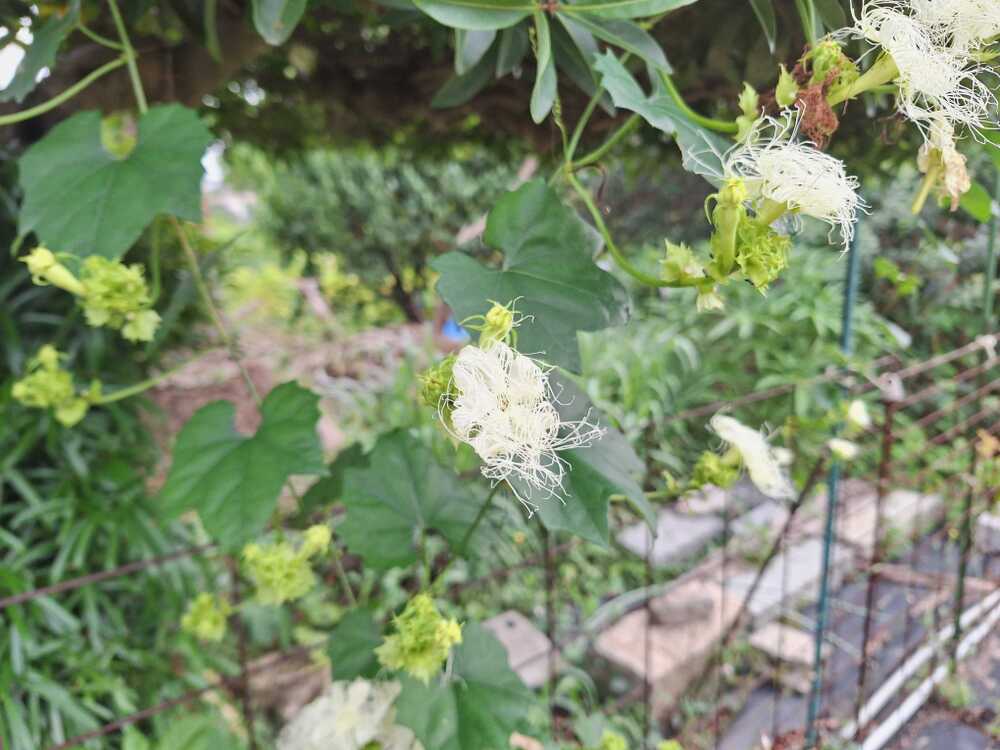 今日は、終日野菜への水やりに追われました。ふとヤマモモの木を見ると、白い花が咲いています。近づいてみると、ヤマモモの木に登りついたカラスウリの花でした。油断も隙もありません。