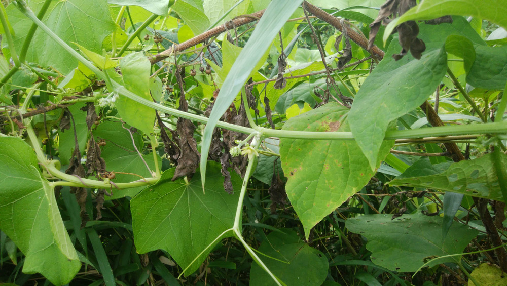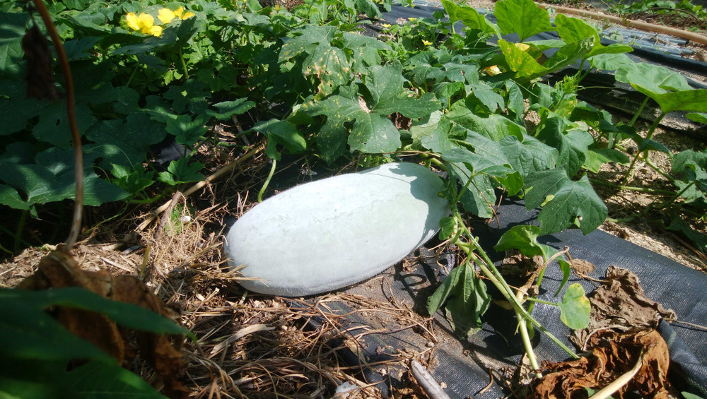 4月下旬に苗を植えたバターナッツカボチャの畑は、夏の乾燥対策として、昨年までの防草シートに換えて、木材チップを敷き詰めてみました。ところが、栽培初期から雑草取りに追われ、結局のところ雑草に覆われてしまい、思ったように収穫できませんでした。
