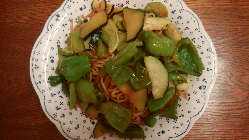ピーマンとズッキーニ、ハムとで焼きそばを作ってみました