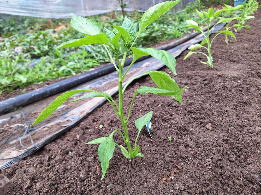 今日は、ピーマンの苗を植えました。手順は、①通路に敷いていた防草シートをはがす ②除草 ⓷施肥(牡蠣殻石灰、牛糞堆肥、鶏糞堆肥) ④中耕 ⑤土ならし ⑥通路に防草シートを張る ⑦土に植穴を開け、水を入れる ⑧苗植え ⑨株元を雑草堆肥で覆う ⑩支柱立て。