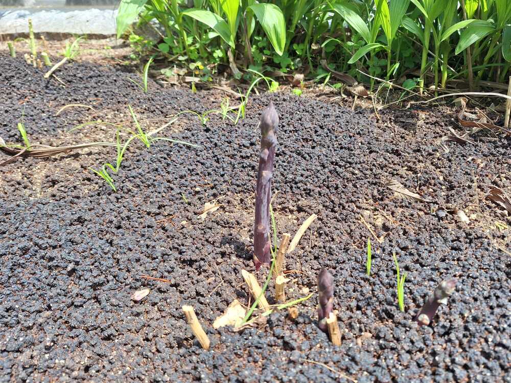 今日は、野菜の収穫日なので、生長の様子を確かめつつ、収穫適期の野菜を収穫していきます。今年は、アスパラガスの生えるのが遅く、今回から、やっと野菜セットに入れることができます。紫のアスパラガスは、今年の一本目と2本目です。水と肥料があれば、6月まで生え続けてくれ、毎日食べられる、大変ありがたい野菜です。