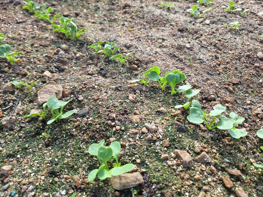 トンネルのダイコンも生え、生長しています。秋蒔きでは芽が出なかったニンジンも、少し生えてきました。今日から暖かい日が続けば、これまで蒔いている野菜の芽生えも期待できます。