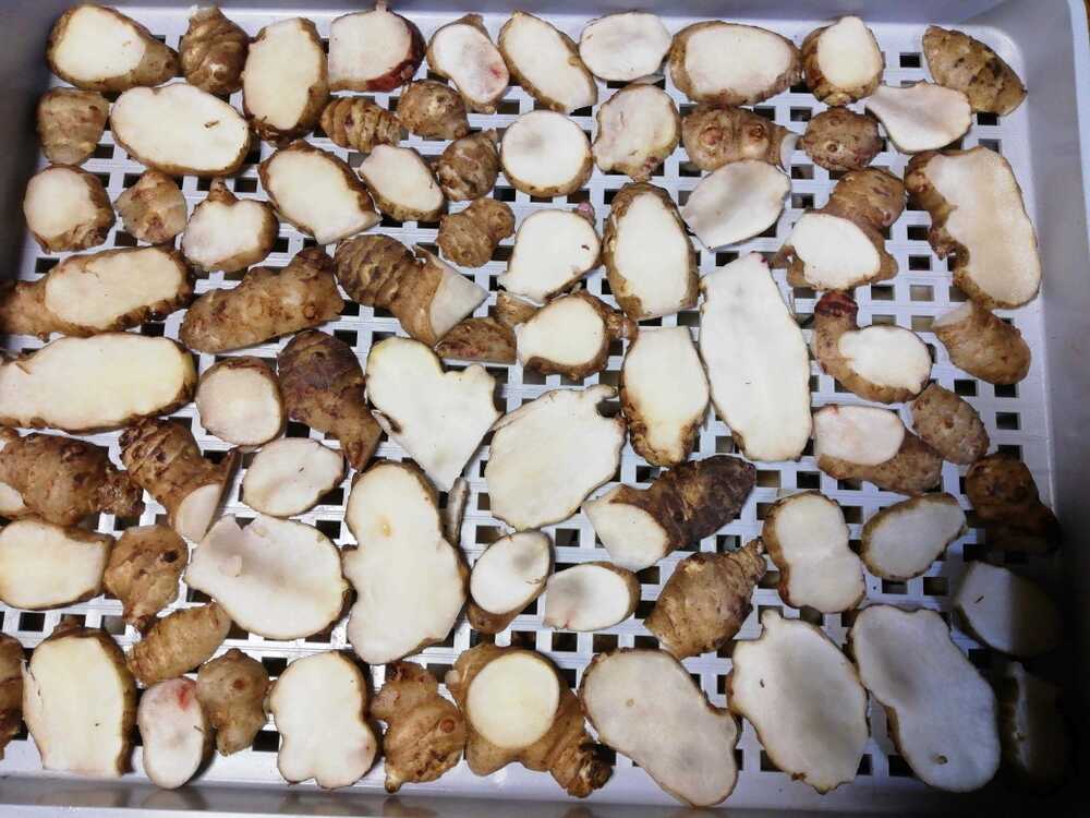 野菜の出荷後、残ったキクイモは、保存が難しいので、すぐにスライスして乾燥機にかけ、キクイモチップスを作っています。