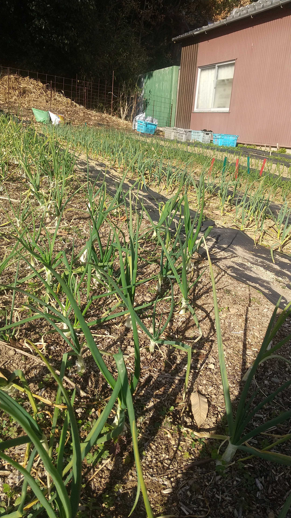 今日は、暖かい日中にタマネギやニンニクの除草をしました。葉付きタマネギや葉ニンニクの収穫のたびに除草をしていますが、雑草が生え、生長するのに追いついていません。今日は、列の左半分だけ。生長に段差がつくから、それもいいかな。