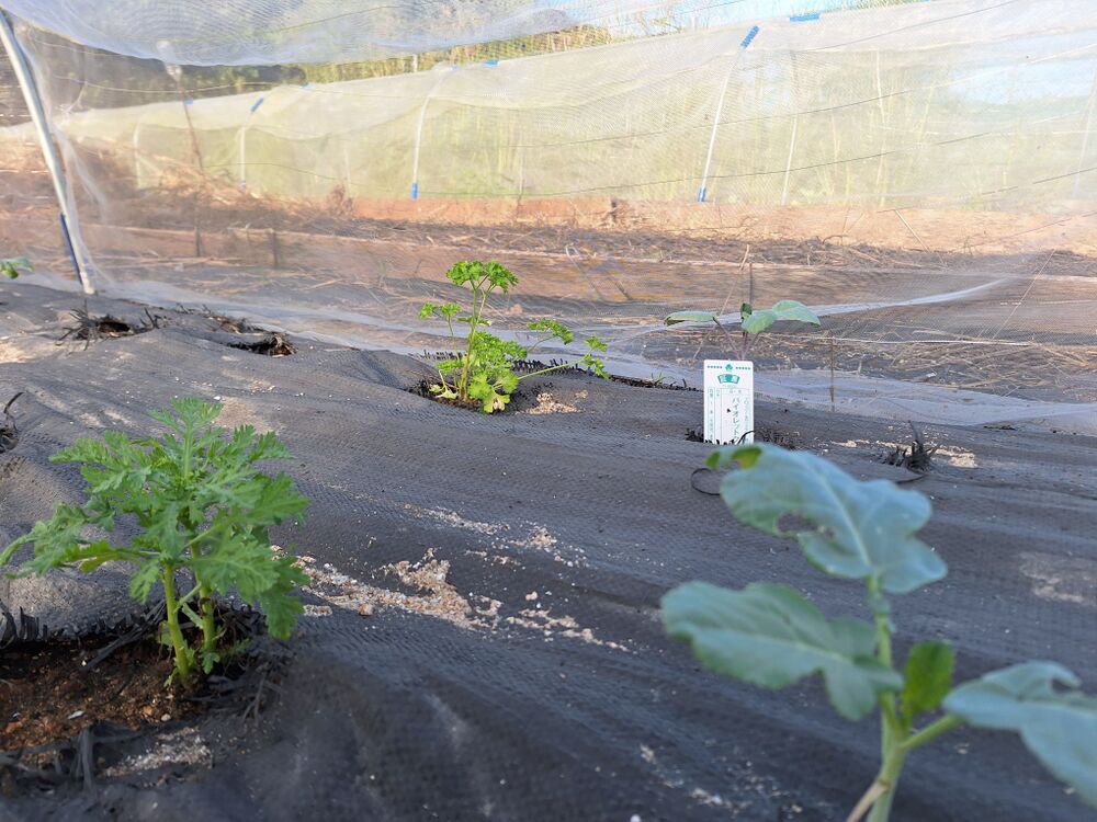 秋の収穫の合間に、やっと葉野菜を植え付けたり、種をまいたりしています。パセリ、ワケギ、ネギが少数夏越ししただけで、あとは全滅でした。キャベツやブロッコリー、カリフラワー、ケール、カーボロネロ。アブラナ科が多いので、害虫対策として、科の違うシュンギク、リーフレタス、ワケギ、ネギ、スイスチャードなどを混植しています。葉野菜の収穫まで、相当時間がかかりそうです。