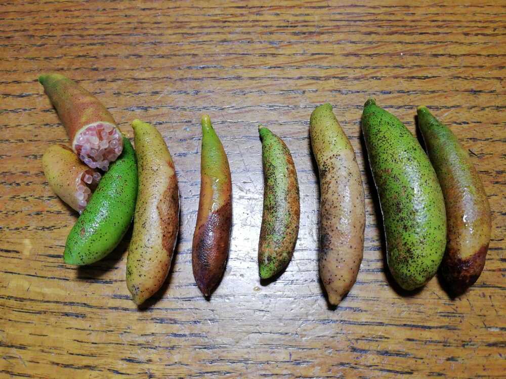 今日は、フィンガーライムを初収穫しました。周りの雑草を除去していると、果実が落果しました。雑草の除去後、果実を拾ってきました。収穫も、食べるのも初体験。楽しめました。