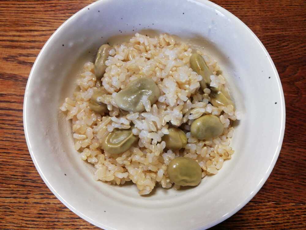 このところ、毎日豆ごはんを食べています。今日は、ソラマメの豆ごはんです。自家製のソラマメやエンドウを、玄米に入れて炊いています。ふっくらと柔らかい豆と玄米の相性抜群です。