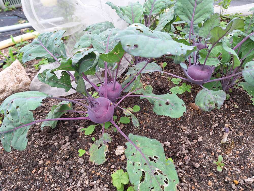 コールラビは、畑に直播にしても、うまく発芽しないこともあるので、ポットで苗を育てたものを、移植するようにしています。このコールラビが、かなり生長してきました。