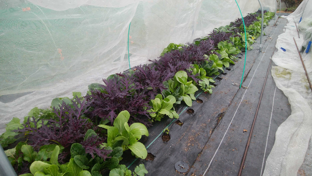 今年は、葉物野菜の栽培場所を、大きく変えました。昨シーズンまで、ジャガイモやカボチャ、タマネギ、ソラマメなどを栽培していた場所です。今は防虫ネットのトンネルで、ニンジンやハツカダイコン、チンゲンサイ、カラシナ、コマツナ、ホウレンソウ、ビーツなどを混植しています。いろんな科の野菜を混植しているのは、病気や害虫を防ぐためです。手前の列に植えていたハツカダイコンはすべて収穫したので、新たに種蒔きをしています。