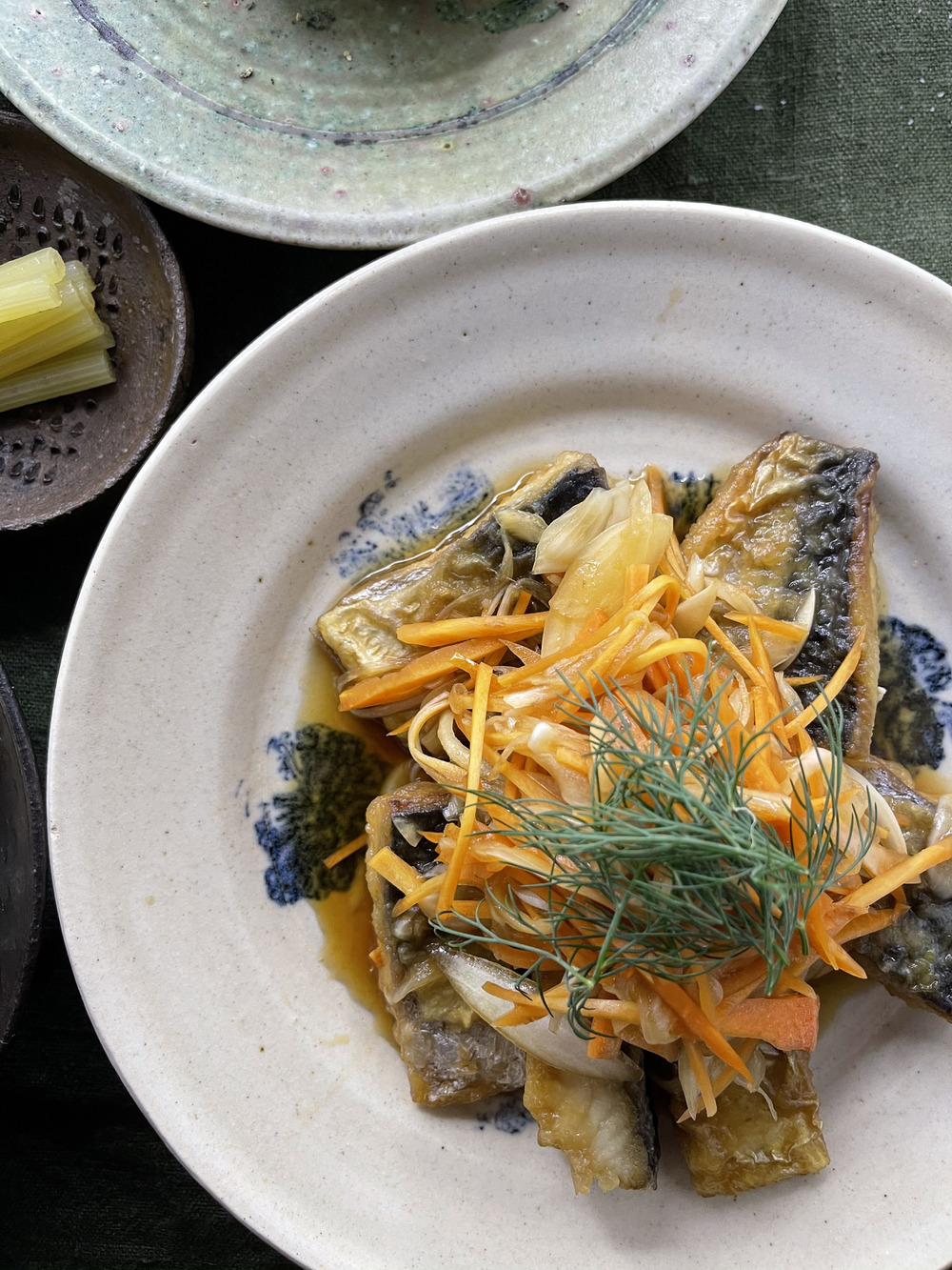 片栗粉をつけて多めの油で揚げ焼きにしたものに、南蛮漬けダレをたっぷりとかけてしばらくおいておいたもの。