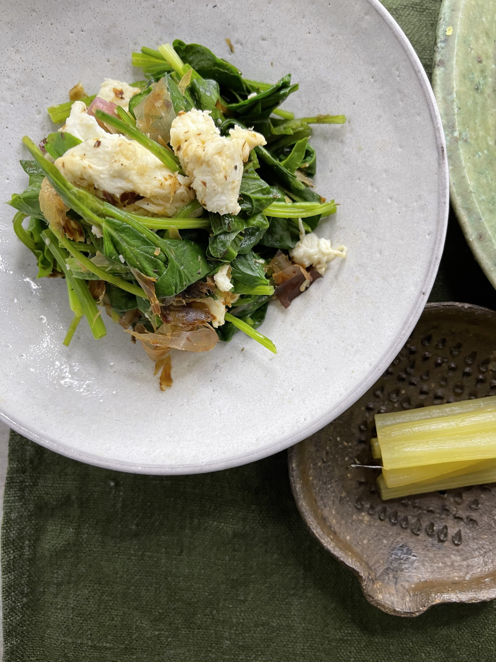 まとめて蒸していたほうれん草は、すこし余っていたモッツァレラチーズとともにおかか醤油和え🥬