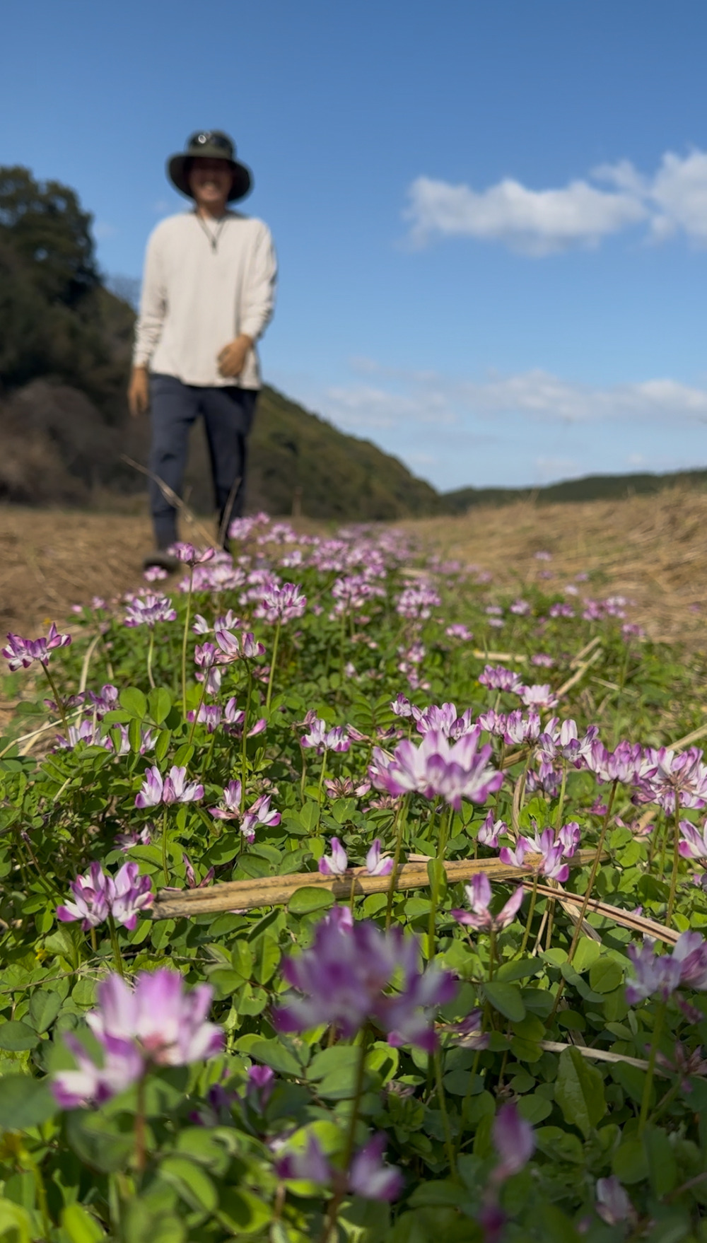 近くは川が流れていて、水の流れる音とと農機具で土を掘る音が響いて心地いいんです。足元はレンゲの花があちこちに