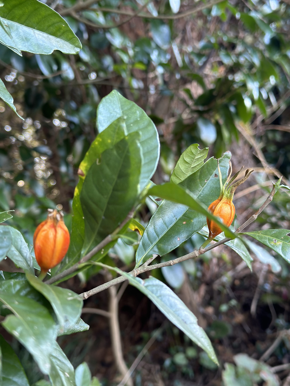 農園へ向かう道ではクチナシの花の蕾が。白い美しい花を咲かすのに蕾は綺麗なオレンジ色なんです。