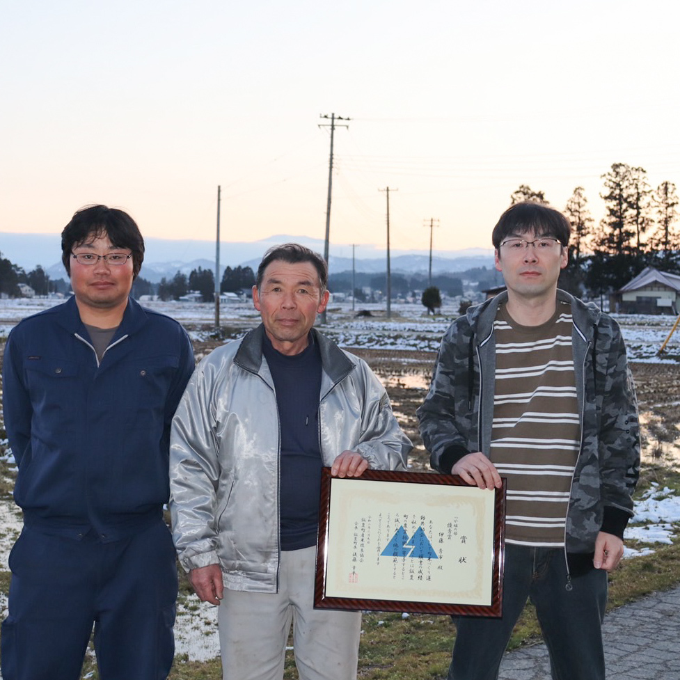 めしゆたかファーム生産者、飯豊町下椿在住の伊藤佐市さん、そしてご子息の伊藤秀市さんが作るつや姫、お米作りに真摯に取り組み続けた結果、飯豊町より優秀賞をいただきました。