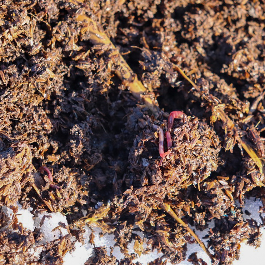 ユンボ(ショベルカー)でワーコム堆肥をすくうと、ミミズがうじゃうじゃ。通常の倍はいます。異様な光景です^^