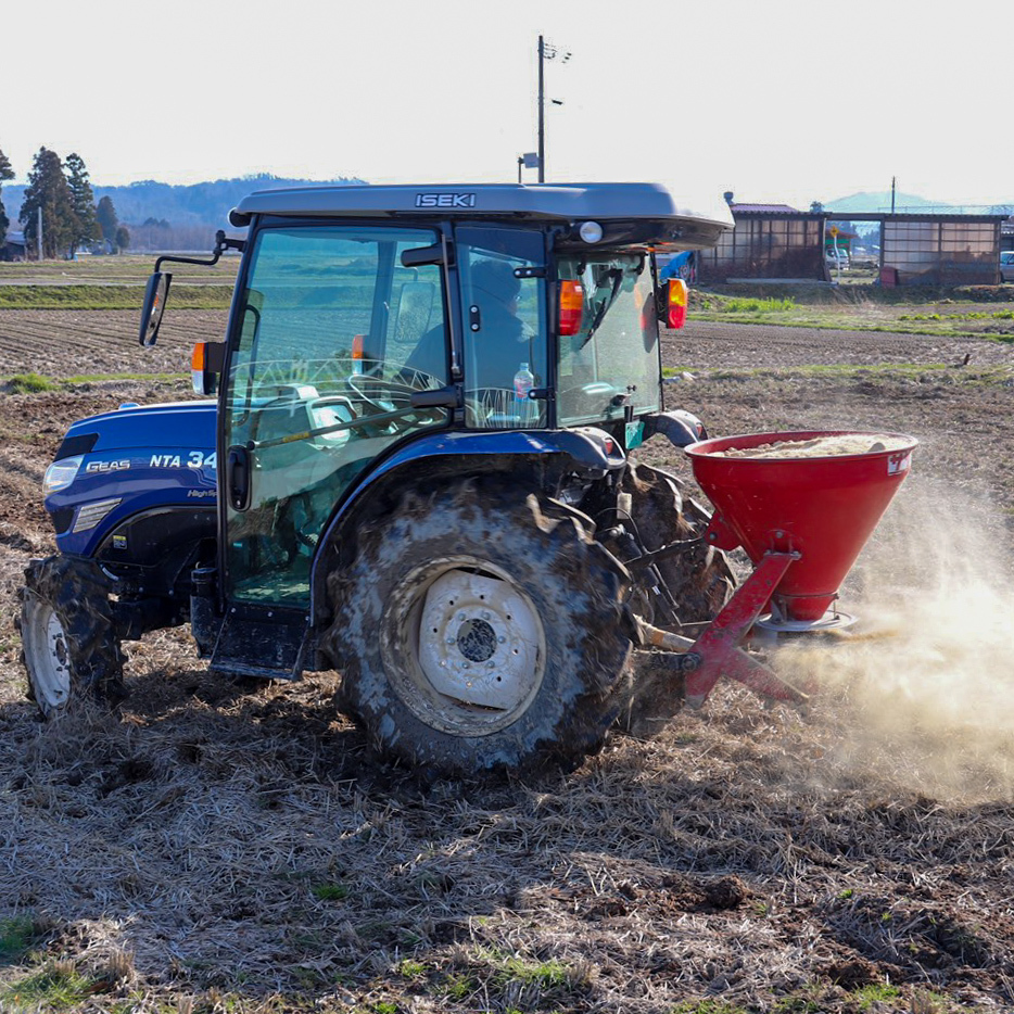 トラクターの後ろに肥料散布機を取り付け、田んぼに振りかけていきます。