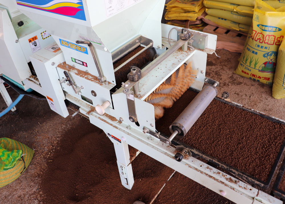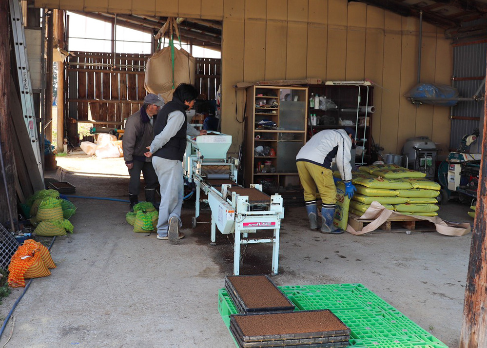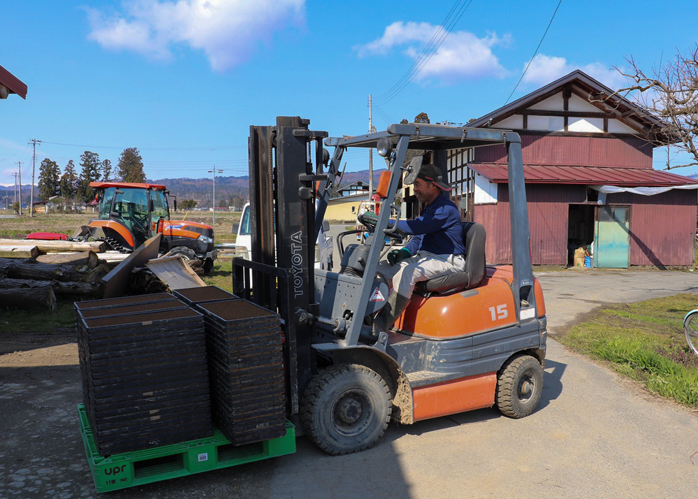 稲作農家にとって一年の始まりである種まきは、人手が多いほど作業は楽になるので、周りの農家さんと協力して行うと疲れ知らず。ぎっしり土が盛られた重い育苗箱をトレーに載せたり、土袋を担いで土ホッパーに補充したりと力仕事が山盛りです。