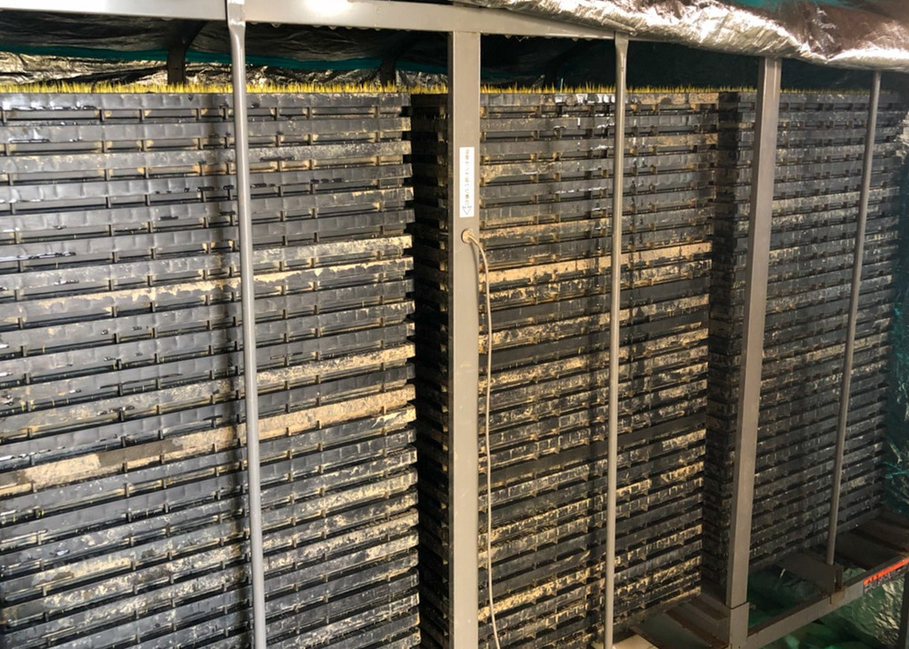 種もみを播いた育苗箱を育苗器に入れ、蒸気式で加温。