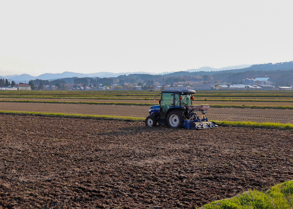 トラクターにロータリー(耕耘用の刃がついたアタッチメント)を取り付け、田んぼをうないます(うなう=耕耘)。