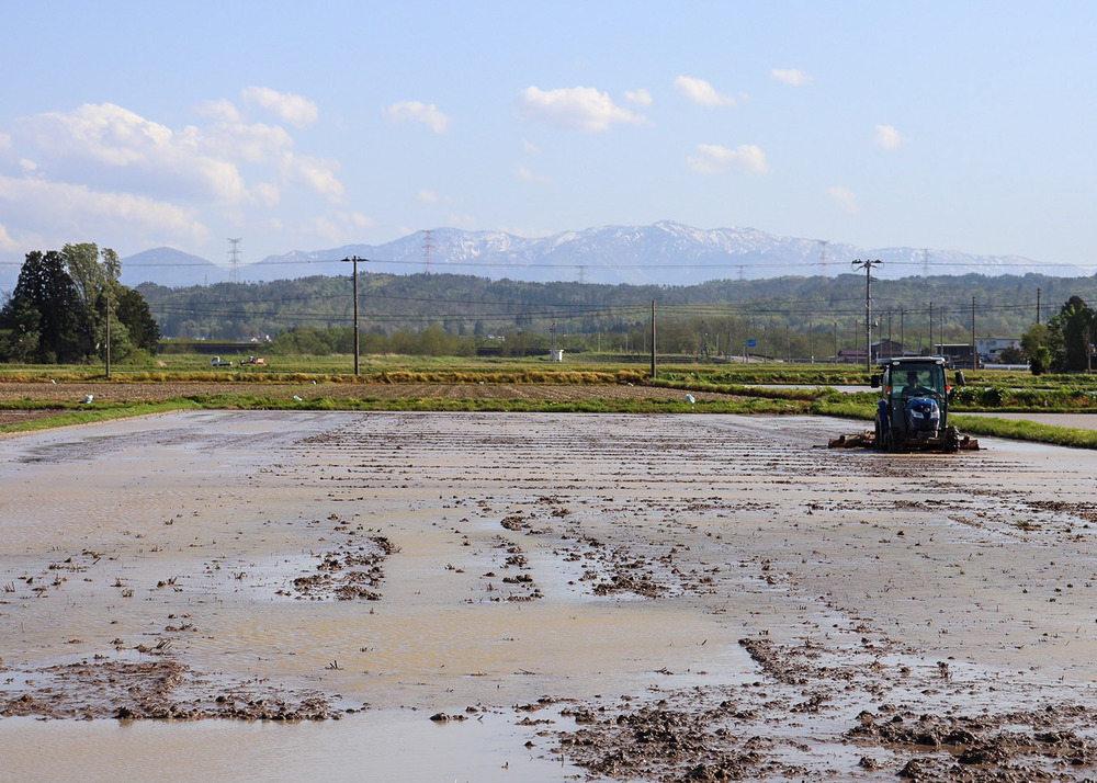 代掻きとは田んぼに水を引き、トラクターにロータリーを装着し、土を均等にならしていく作業です。