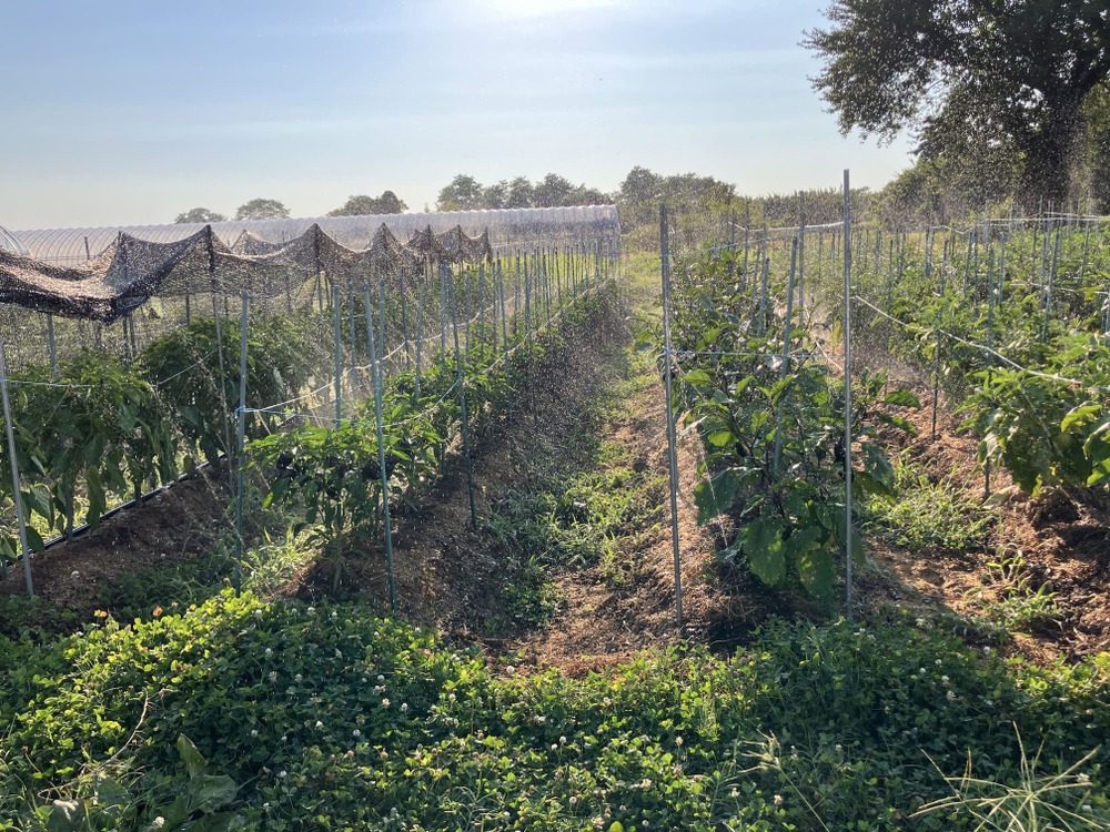 畑でも真夏の太陽がさんさんと降り注いでいて、散水の水しぶきがキラキラ輝く中、ナスたちがぐんぐん成長しています。