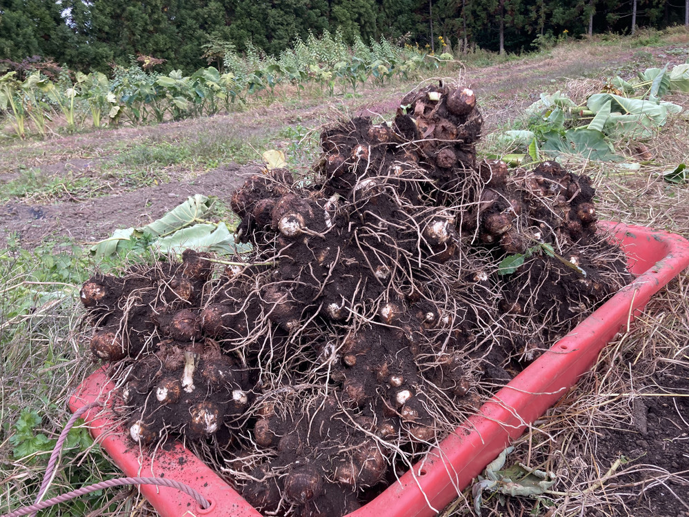 里芋といっても、海老芋やら石川早生やら土垂やら・・・すごくいっぱいの品種があるのですが、私どもが育てているからどり芋という山形の在来品種の里芋がおいしいのです。
