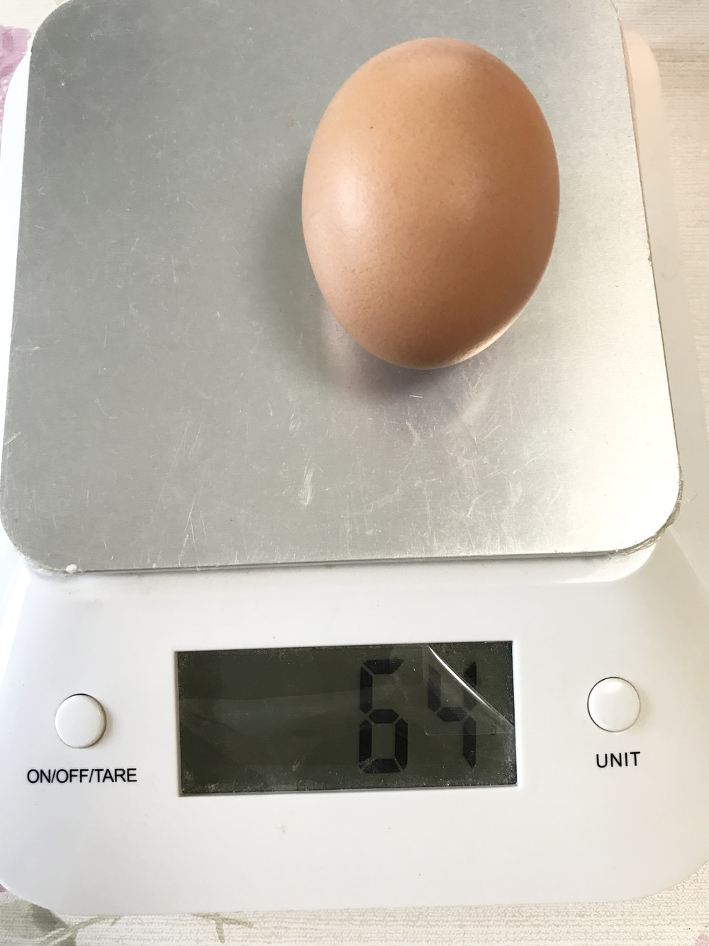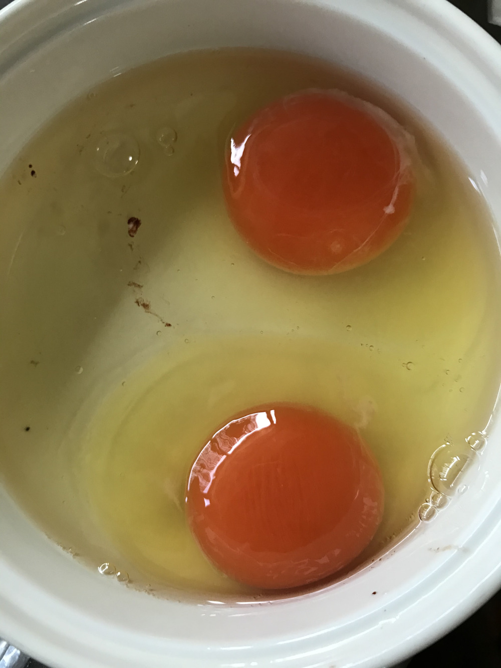 普通の卵が規格によるけどLサイズ64-70gなので、2.5倍のサイズ。割ってみると卵の黄身は二つでした!