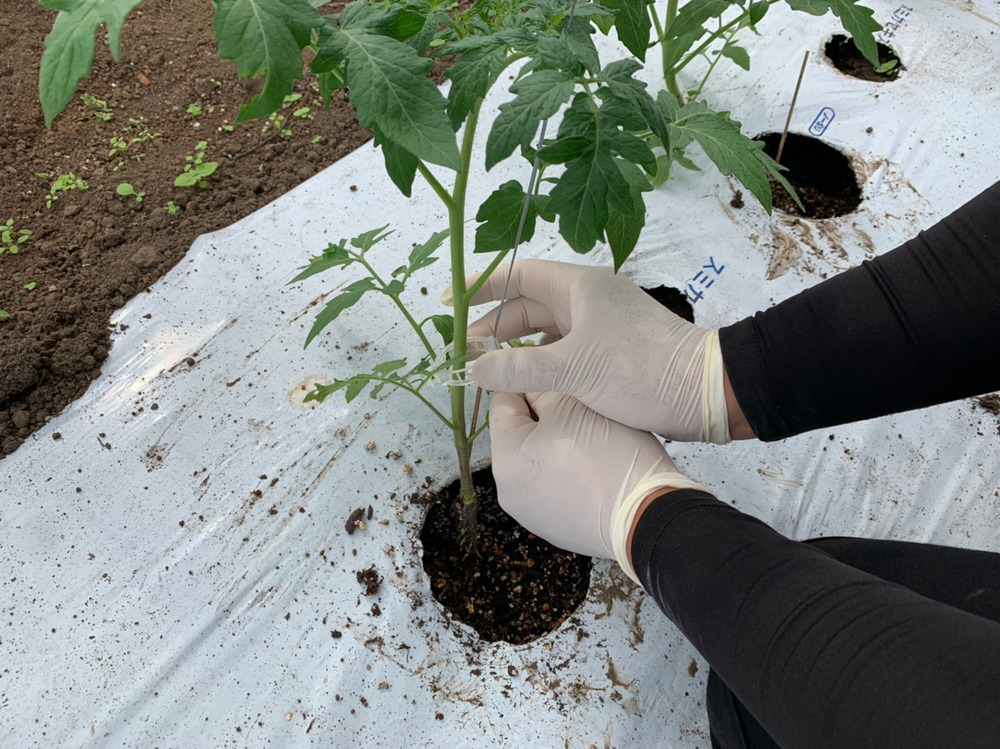 写真はトマトの誘引と言われる作業です。