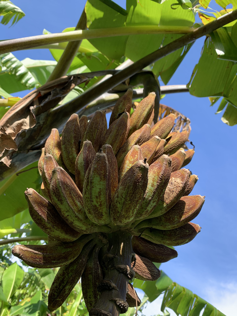 このバナナ赤ちゃんの頃は島バナナやナムワ系バナナにそっくりで色も緑色なんですが成長と共に褐色になりとても珍しい見た目になるんです。