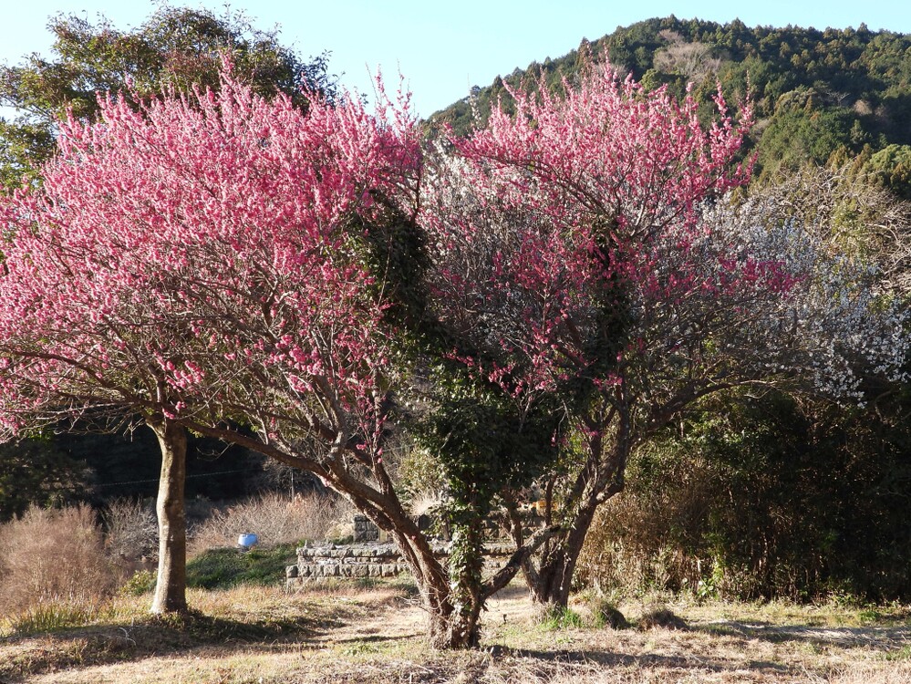 ※相変わらずの富士山とたわわに実った駿河あまなつ、キウイ畑に敷くための萱場(草)にある紅白の梅が満開でしたので、今朝(2026.2.1)撮影してみました。