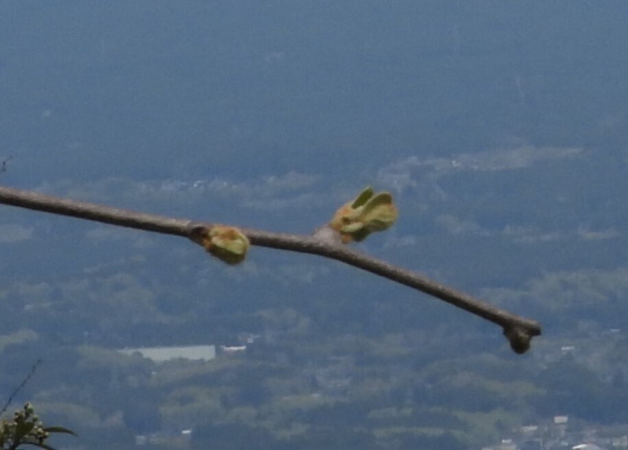 キウイ畑からの撮影です。誘引作業中の畑でキウイの枝から新芽が出ています。初夏にはここに実が付き段々と大きくなります。