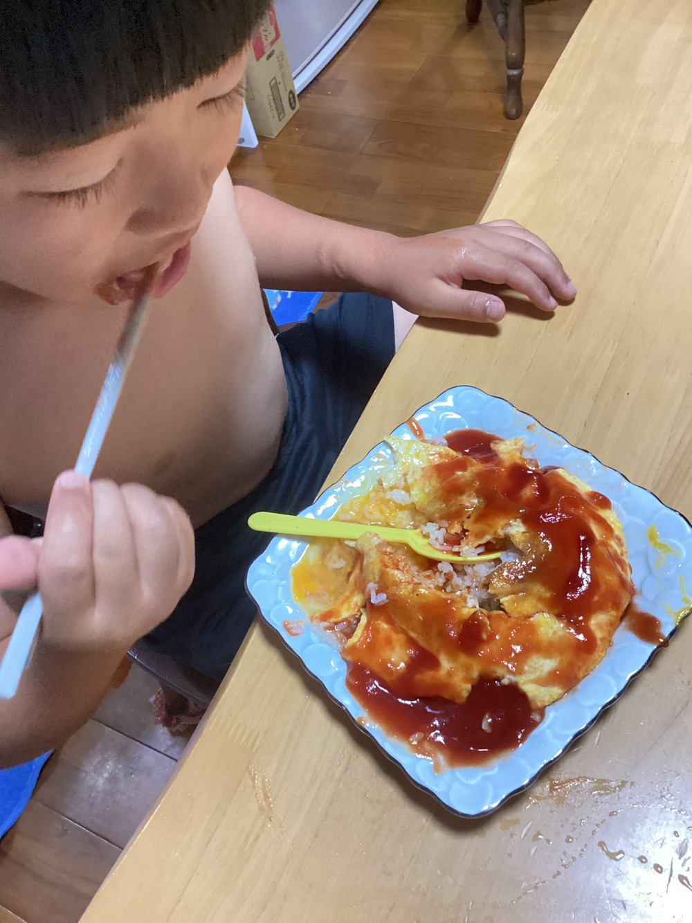 このオムライスも自作。とにかく何でもするから服も靴もぼろぼろで)