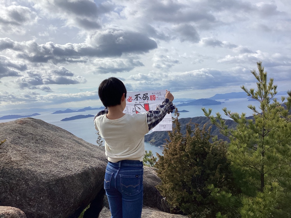 娘は決意を持って合格の手拭いを