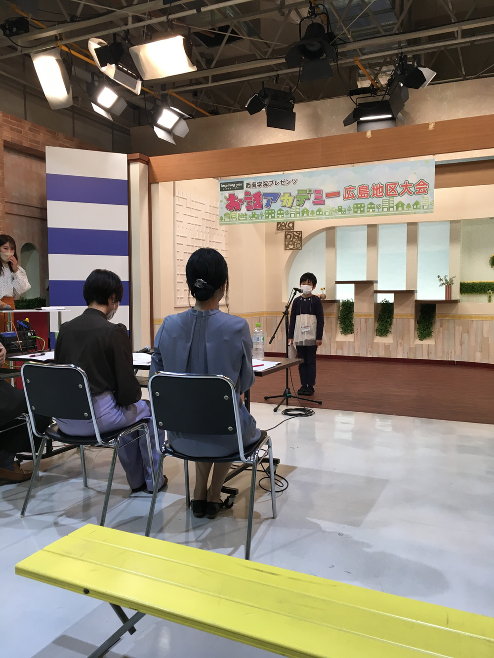 ステージ上で、アナウンサーの前で朗読