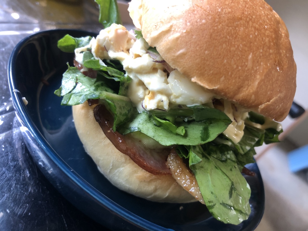 ルッコラ→パンにベーコンと卵タルタルにルッコラたっぷりでアクセント強めで😋