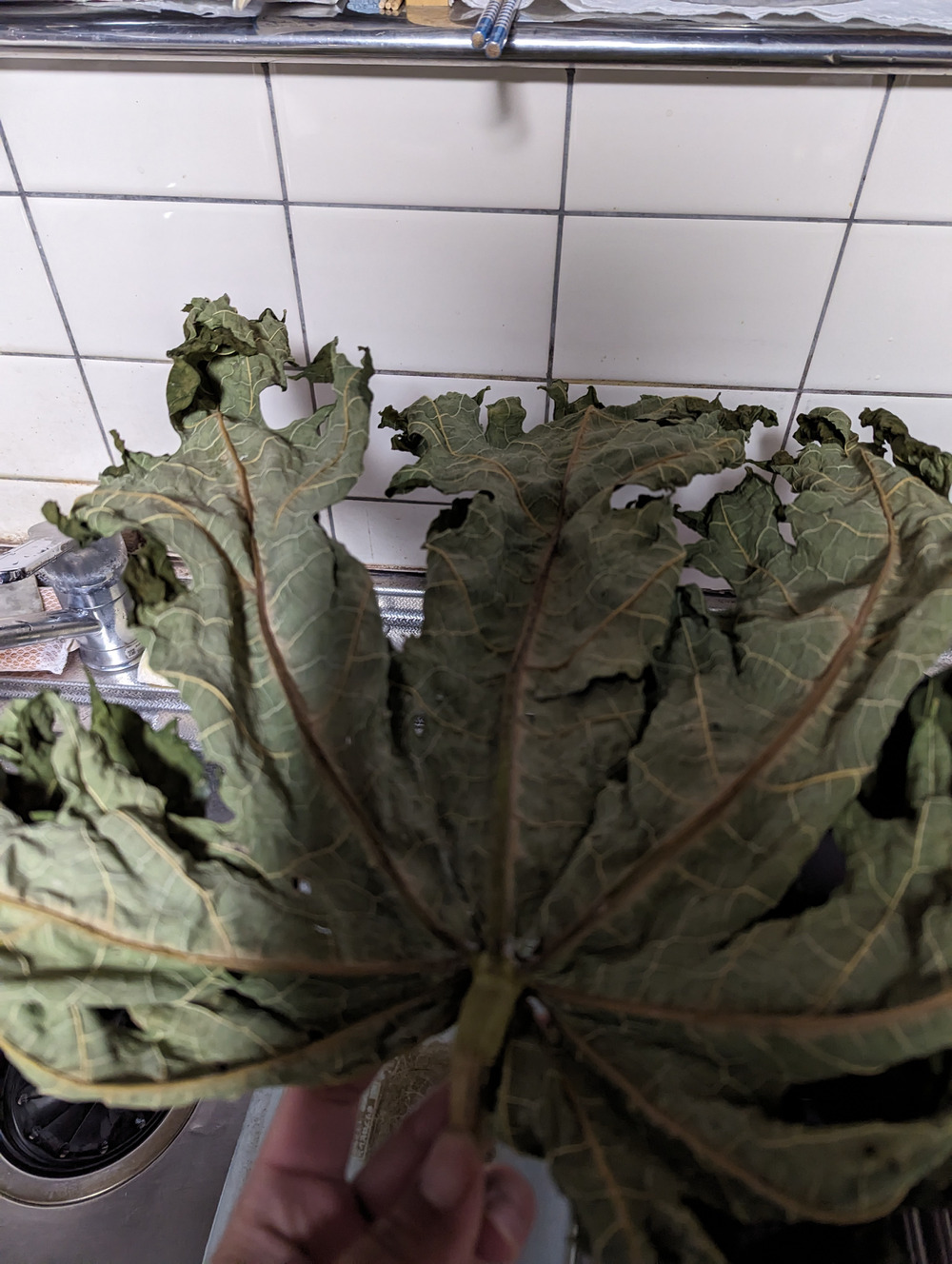 パパイヤの葉を乾燥させる⇛ドライヤーでホコリをとばす⇛フライパンで煎る