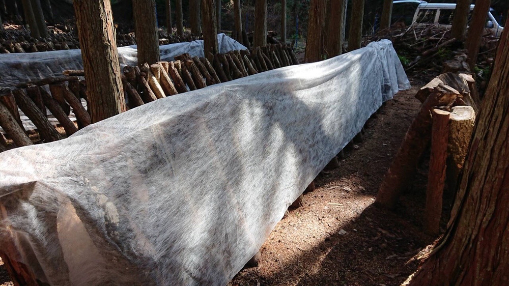 明後日から気温が下がるので、椎茸が凍らないようにシートを掛けました。