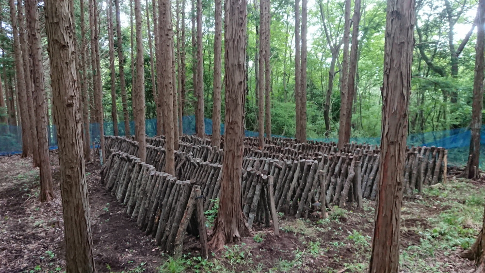 去年の春に椎茸菌を植えた原木を、収穫しやすいように圃場に立てる作業です。