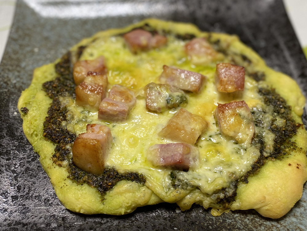 バジルで作ったジェノベーゼソースはベーコン チーズで ジェノベーゼピザに。