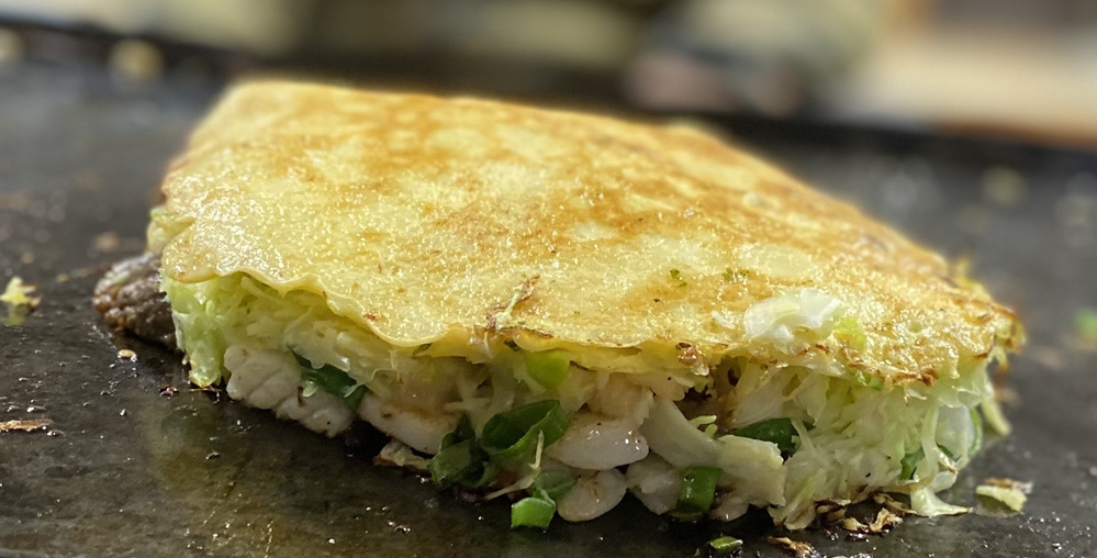 キャベツとねぎたっぷりのお好み焼きを作りました。広げた生地の上に5センチくらいのキャベツを乗せてねぎもたっぷり散らしてそれから好きな具材で焼きます。ゆっくりじっくり火を通すとキャベツがより甘ーくしっとり。ジューシー野菜のお好み焼きです。