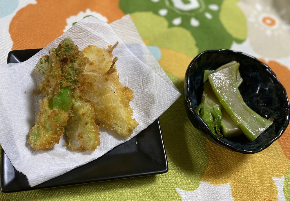野菜フライは 新玉ねぎと子持ち高菜 子持ち高菜は好きな野菜の一つですが 中々上手に育てられなかったのです。やっと収穫 明日から出荷しようと思っています。小皿は 子持ちのバター焼きです。ちょっぴりほろ苦い春の味です。