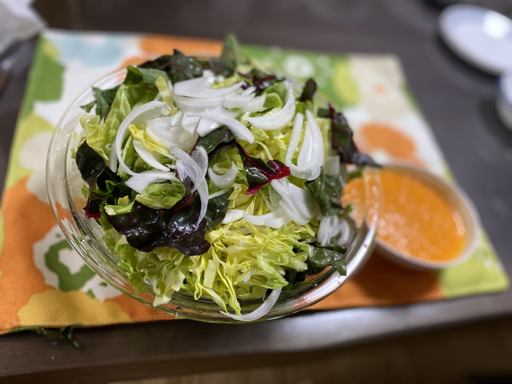 このキャベツとスイスチャード 新玉ねぎ かぶら 小松菜 サニーレタス レタスでサラダを作りました♪ドレッシングはにんじん🥕ドレッシングです。
