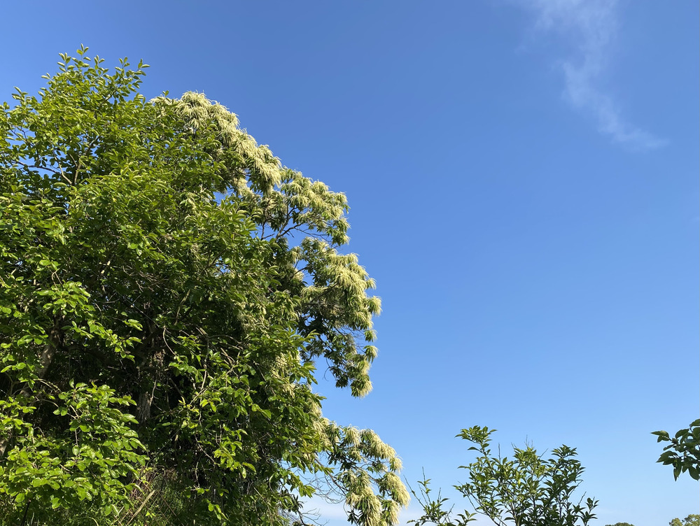 栗の木に一面の花が咲きました。手前は柿の木