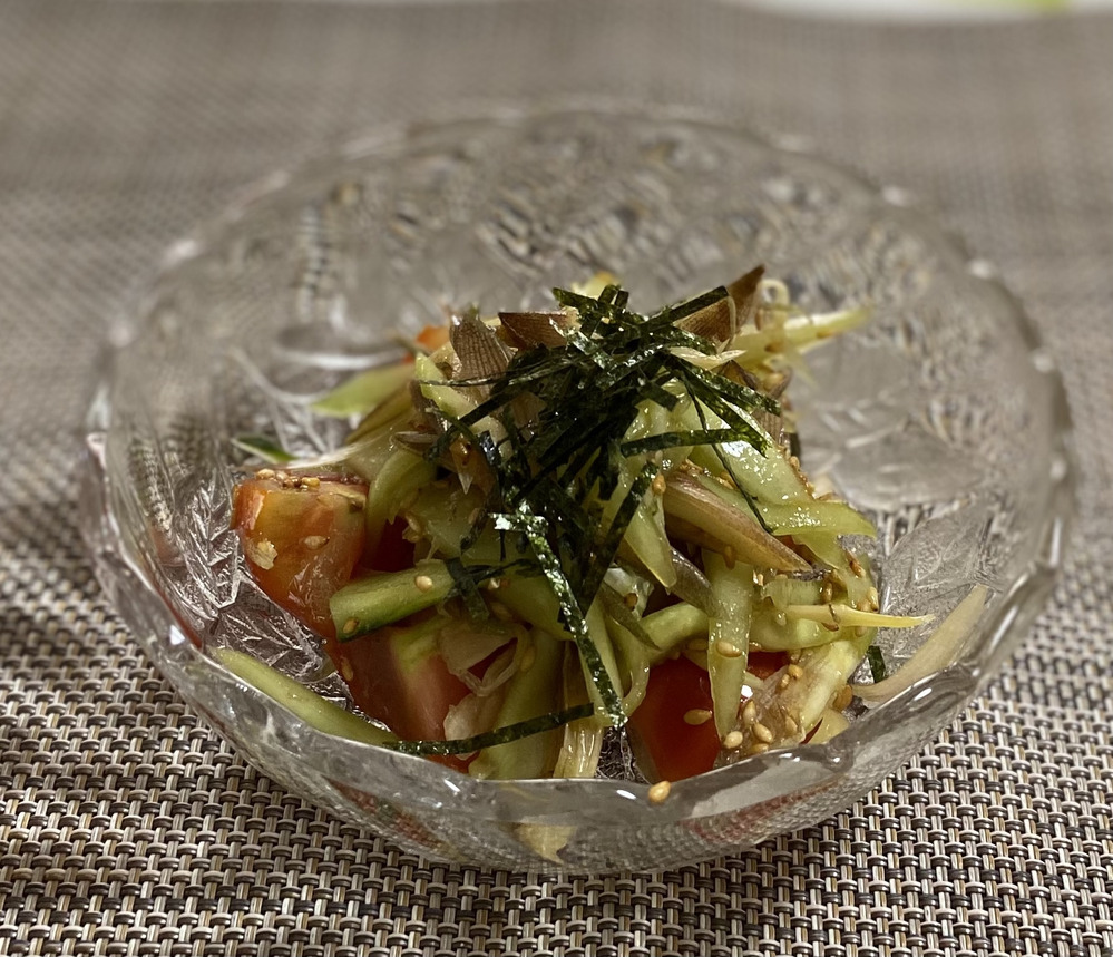 みょうがときゅうりとトマトの胡麻和えを作ってみました。ふふふ おいしいです。