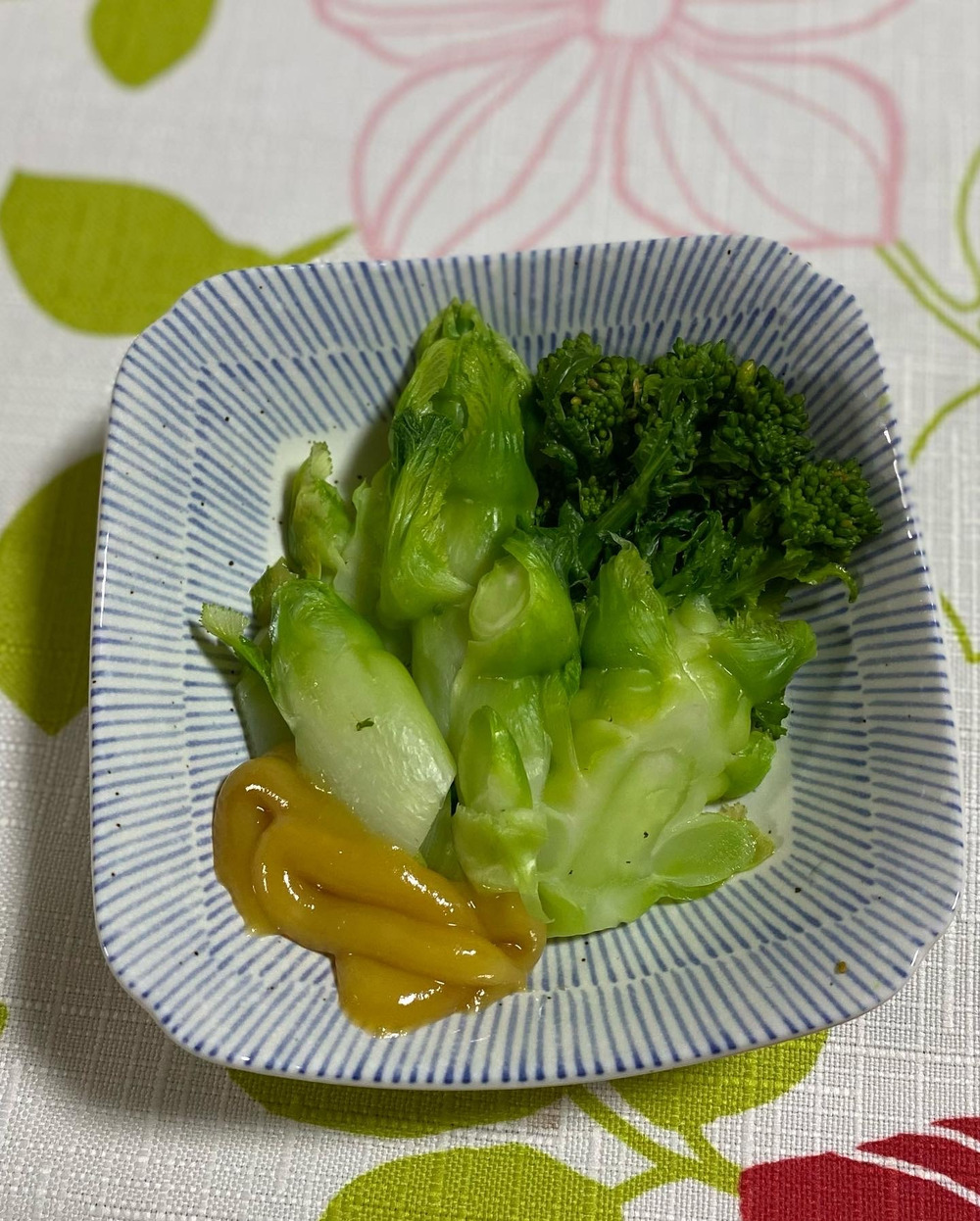 子持ち高菜と菜花の酢味噌あえ 芽キャベツのバター醤油ソテー サラダかぶらラティーナの千枚漬け 新玉ねぎの葉の卵とじ 子持ち高菜の茎のきんぴら キャベツ胡瓜新玉ねぎのコールスロー たくさんいただきます。冬の野菜はおいしい‼️